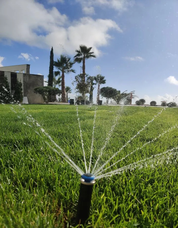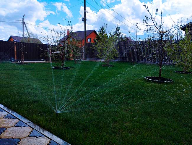 У нас можно заказать монтаж под ключ 3 вида автополива. Для орошения больших площадей чаще подходит дождевание. Вода подается брызгами или микро-каплями в виде тумана.